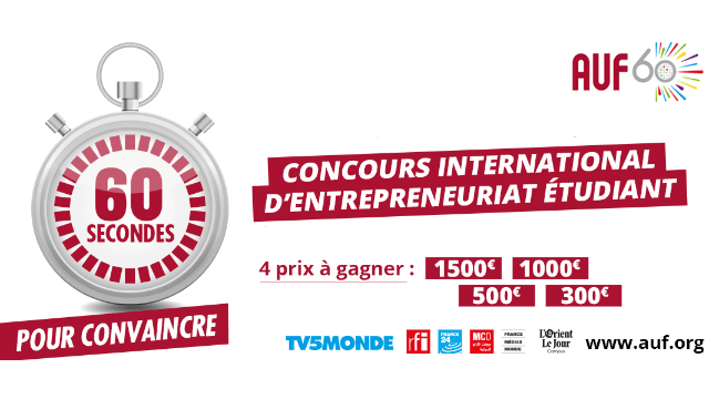 A l'occasion de son 60ème anniversaire l’AUF, en partenariat avec TV5MONDE, France Médias Monde (RFI, France 24, Monte Carlo Doualiya) et L’Orient-Le Jour, a lancé en juin 2021 un concours pour valoriser l’esprit d’entrepreneuriat chez les jeunes. Il s’agissait de présenter son projet en 60 secondes chrono en format vidéo. Dix finalistes de dix pays sont en lice. Votez pour votre vidéo préférée. La ou le lauréat.e recevra le Prix coup de cœur du public.